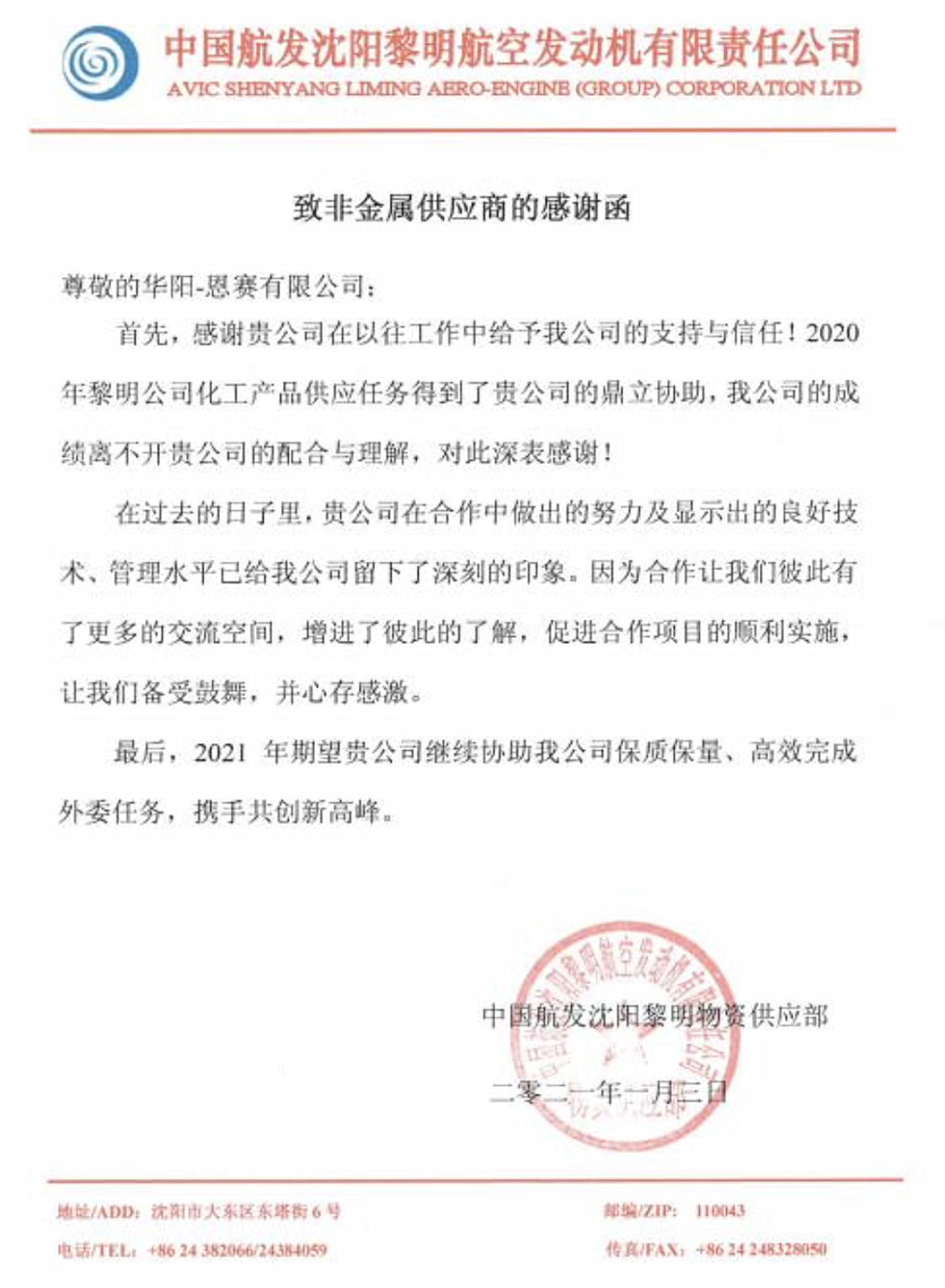 日前,NCH集团在华子公司华阳-恩赛有限公司收到中国航发沈阳黎明航空发动机有限责任公司(以下简称中国航发黎明)发来的感谢信,信中中国航发黎明对华阳恩赛长期以来的协助配合表示感谢,对华阳恩赛良好的技术和管理水平给予充分肯定。