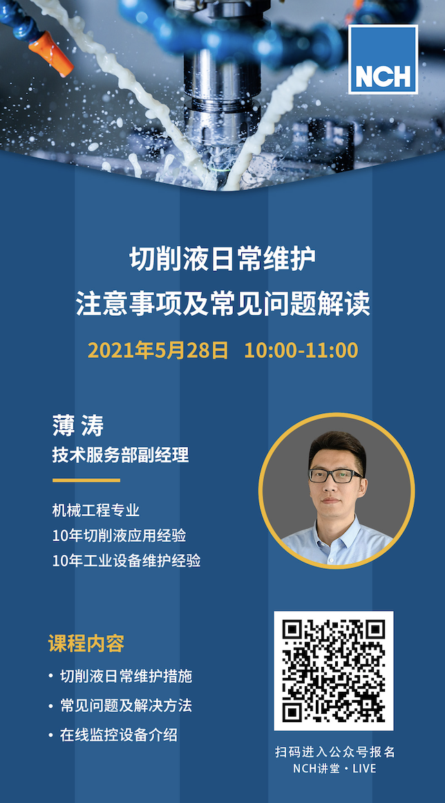 为什么会有这么多问题?除了切削液产品的选择以及切削液本身品质的原因外,更多的是因为切削液使用和维护管理不当所致。 5月28日的线上研讨会,NCH中国技术服务部薄涛老师将给大家详细解读切削液的日常维护、注意事项及常见问题的解决方案。