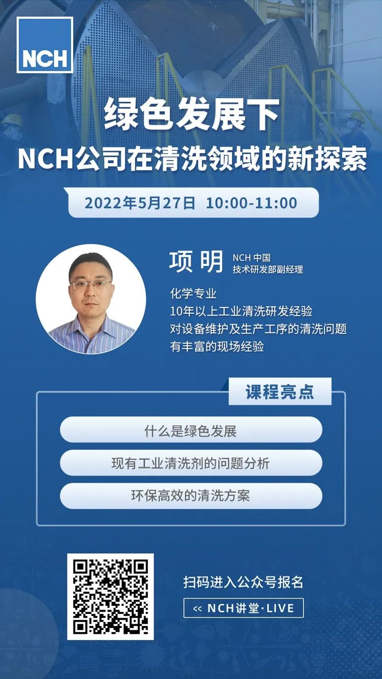 欢迎参加5月27日NCH集团在线研讨会,我们的技术研发专家将与大家分享在绿色发展下,NCH公司在清洗领域的新探索。